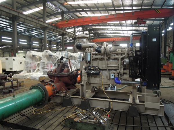 2013年3月我廠與美國客戶簽訂七臺XS300-470柴油機單級雙吸離心泵,此次簽訂的XS300-470型號單級雙吸離心泵是我廠根據客戶需要單獨開發的型號。4月12日我廠測試站對整機開始進行測試,隨著配套常用功率507KW柴油機的啟動,測試站工作人員開始對各項參數進行測試,測試項目包括:性能測試、出水口壓力、進水口壓力、氣蝕余量、震動測試、柴油機噪聲測試、軸功率、工頻、轉速等運行測試。經過兩小時的連續運轉測試,XS300-470柴油機單級雙吸離心泵運行工況正常,各項指標符合設計要求。