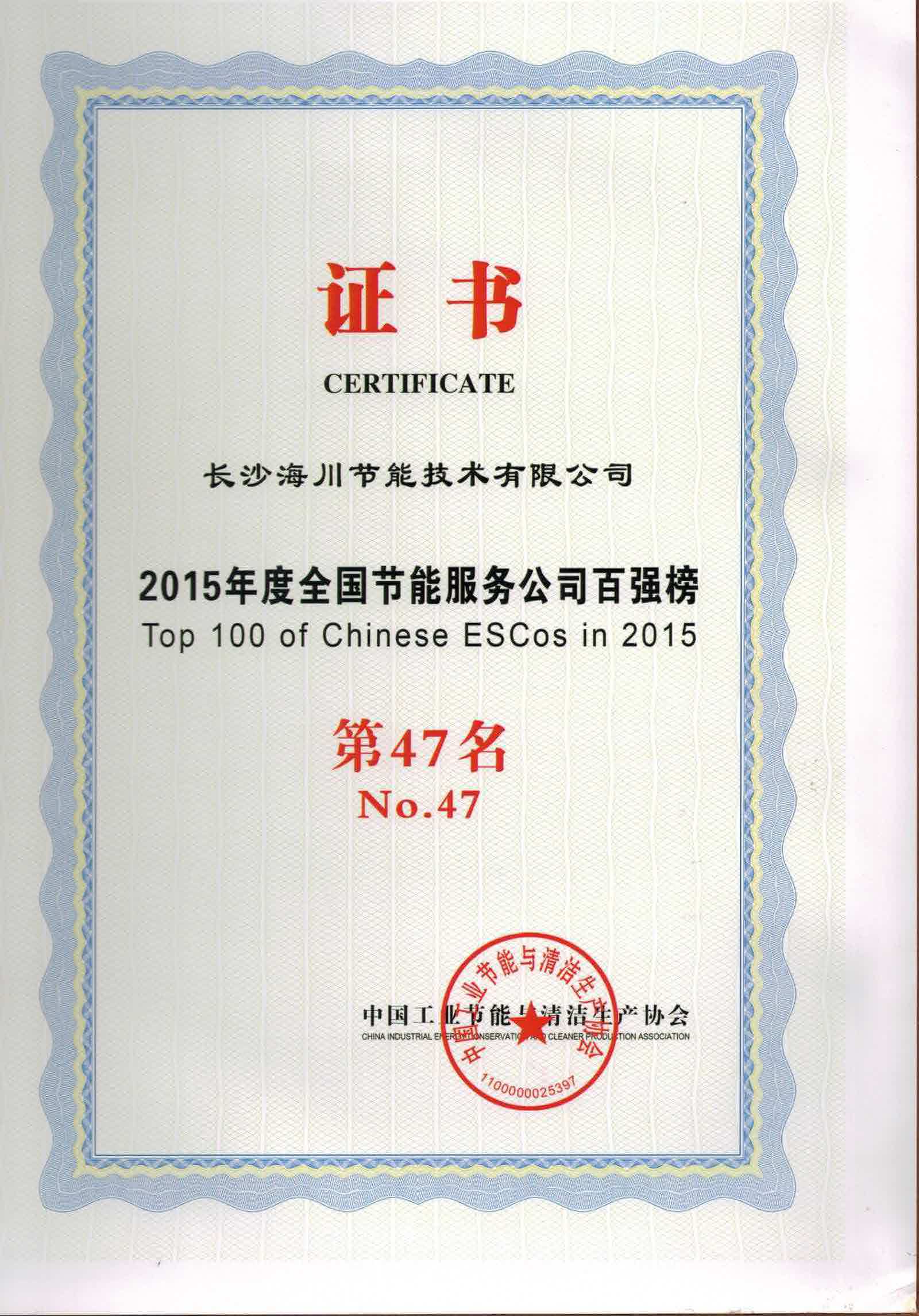 2015年12月,“中國節能服務產業發展論壇暨2015中國節能服務公司百強榜發布會”在四川成都舉行,中國工業節能與清潔生產協會發布了2015年度中國節能服務公司百強榜榜單及研究報告。山水集團下屬分公司海川節能以豐富的節能成果,榮獲2015全國節能服務百強企業。