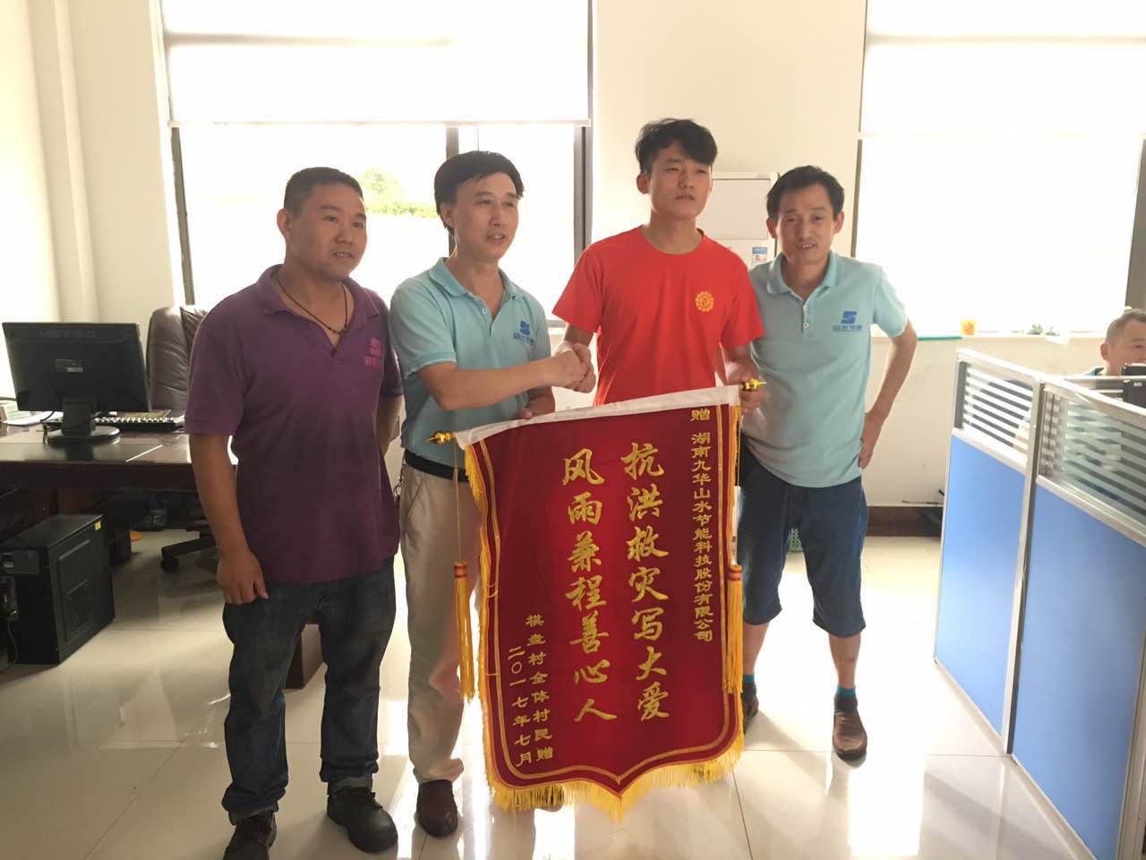 災難面前,山水人豪不退縮,持續關注災情。山水集團管委會號召全公司員工投入災后重建工作中,并倡導管理層干部做好模范帶頭作用。“抗洪救災寫大愛,風雨兼程善心人”這是外界社會對我們的肯定。