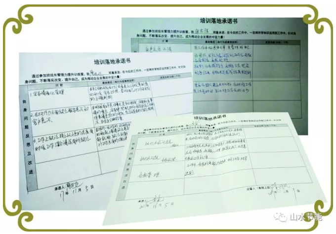 培訓回司后,我們的班組長把培訓成果進行總結,學到的知識運用到工作中,并制定改進計劃形成落地承諾書交直接上級簽字,亮出山水全新風貌!