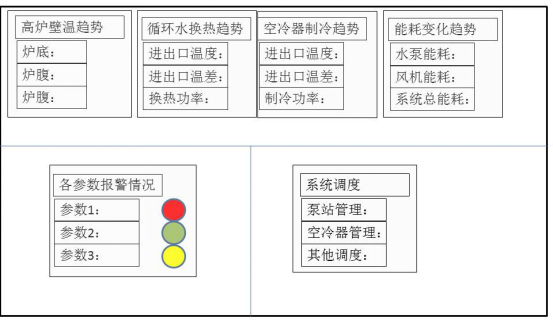 對(duì)與系統(tǒng)節(jié)能密切相關(guān)的參數(shù),顯示其歷史變化趨勢(shì),這些參數(shù)應(yīng)當(dāng)包括但不限于循環(huán)水流量、高爐循環(huán)水進(jìn)口溫度、高爐循環(huán)水出口溫度、高爐循環(huán)水溫差、高爐循環(huán)水換熱量、空冷器循環(huán)水進(jìn)出口溫度及溫差、爐壁溫度值(最大值、最小值和平均值)、風(fēng)機(jī)功率、水泵功率和系統(tǒng)功率等。