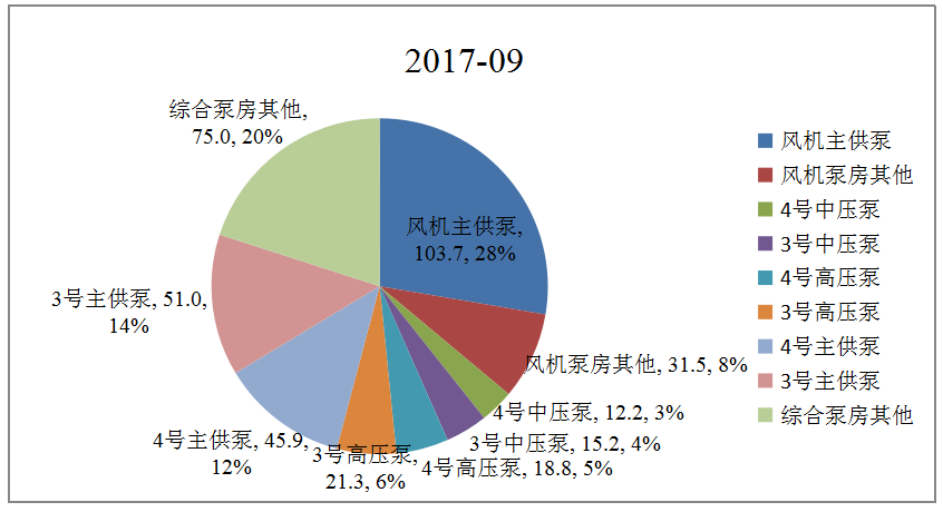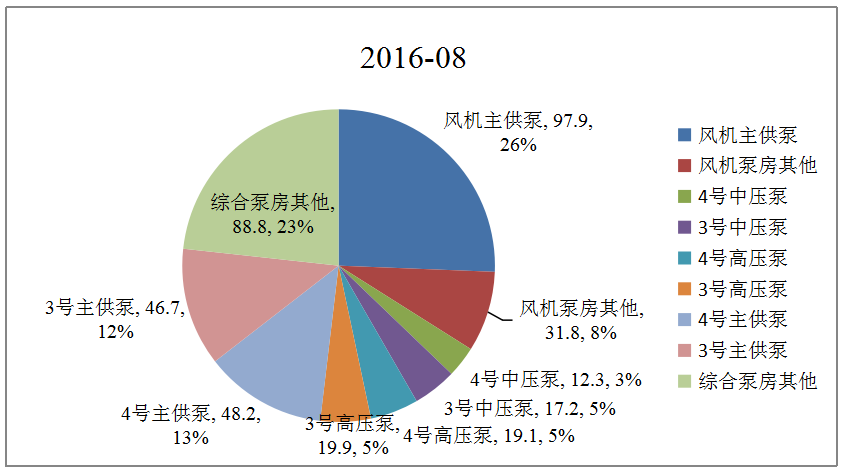 2016年8月和2017年9月的耗電餅圖分別見圖5和圖6所示,餅圖中給出了每一個泵站的當月耗電值以及其占總耗電的比例,可以觀察分析耗電占比的變化趨勢,幫助尋找項目收益變化的主要因素。