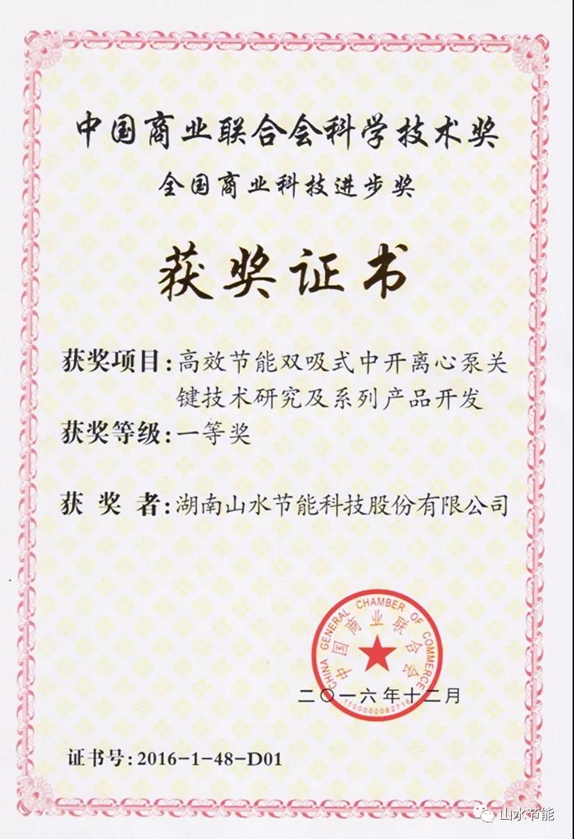 經機械工業排灌機械產品質量檢測中心檢測,本項目研究的產品效率高,高效范圍寬,性能優于國家標準要求,試驗效率高于國家標準的規定值1~12個百分點,效率指標高于國內外同類產品測試,經眾多用戶使用,實用性強,效果良好。專家鑒定其綜合技術指標達到國際先進水平。2018年9月17日,2018年全國商業科技質量大會在北京人民大會堂隆重召開。全國商業科技獎是經國家科技部批準設立的我國商業行業科技創新方面最具權威的綜合性獎項,旨在獎勵在全國商業行業科學研究、技術與管理創新、成果推廣、高新技術產業化中做出突出貢獻的組織、個人和科研項目。