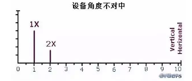 不對中的兩個軸相交于一點但互相不平衡,這樣的不對中稱為軸線角度不對中。軸線角度不對中會在軸上產生一個彎曲作用,在頻譜上顯示為高強度的1X振動和在兩端的軸承上的少量軸向2X振動。還會有相當強的徑向(水平和垂直方向上)1X和2X振動,但是這些振動頻譜都是相同的;