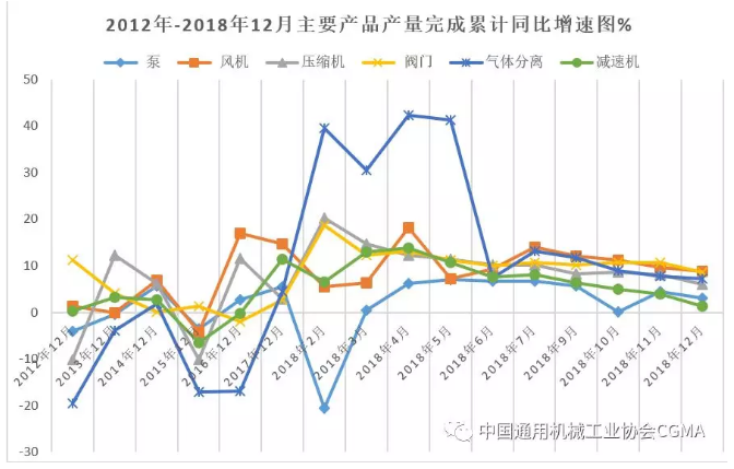 2018年1-12月,通用機(jī)械行業(yè)在國(guó)家統(tǒng)計(jì)局統(tǒng)計(jì)數(shù)據(jù)中,6種主要產(chǎn)品產(chǎn)量完成穩(wěn)中有增,其中:閥門、氣體分離及液化設(shè)備增速較上年分別提升5.75和2.87個(gè)百分點(diǎn),泵、風(fēng)機(jī)、壓縮機(jī)、減速機(jī)增速分別比上年下降2.24、5.95、9.14、9.96個(gè)百分點(diǎn),產(chǎn)品完成情況見表一。從產(chǎn)品完成累計(jì)同比增速圖一看,2018年產(chǎn)量完成增速趨穩(wěn)、態(tài)勢(shì)趨緩。