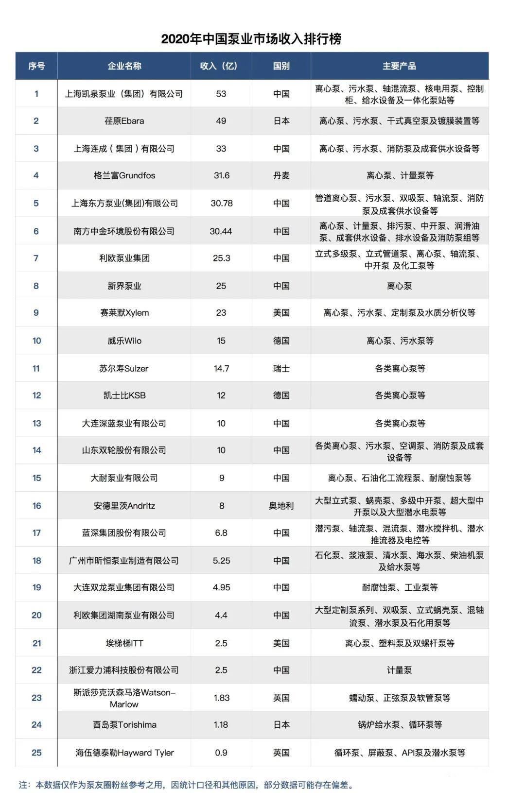 2020年中國(guó)泵業(yè)市場(chǎng)收入排行榜